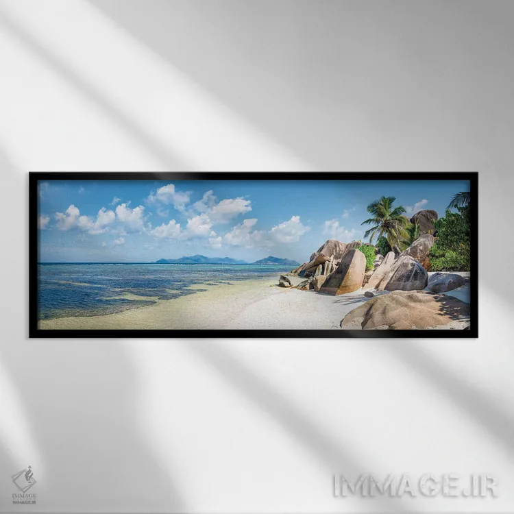 تابلو Seychelles,نمای پانوراما از ساحل آنسه سورس دارژان در جزیره لا دیگ، سیشل اثر یان بکه - نمای قاب‌دار مشکی