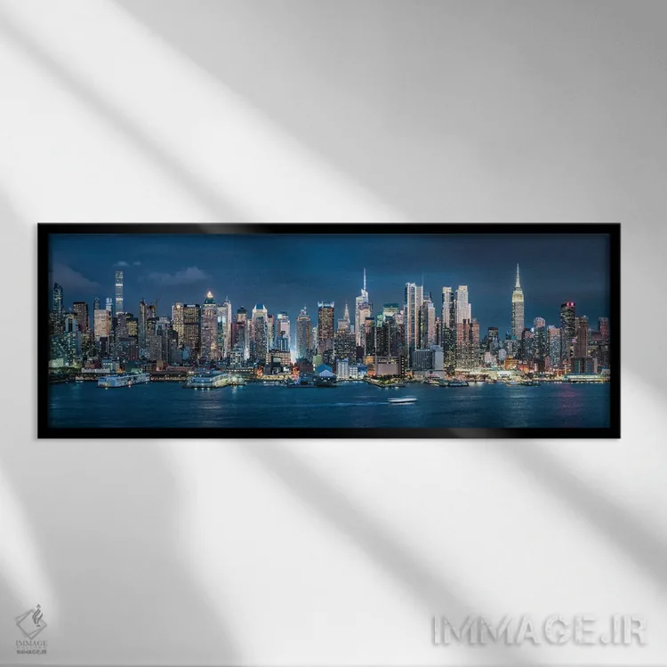 تابلو پانورامای افق منهتن در شب اثر یان بکه - نمای قاب‌دار مشکی