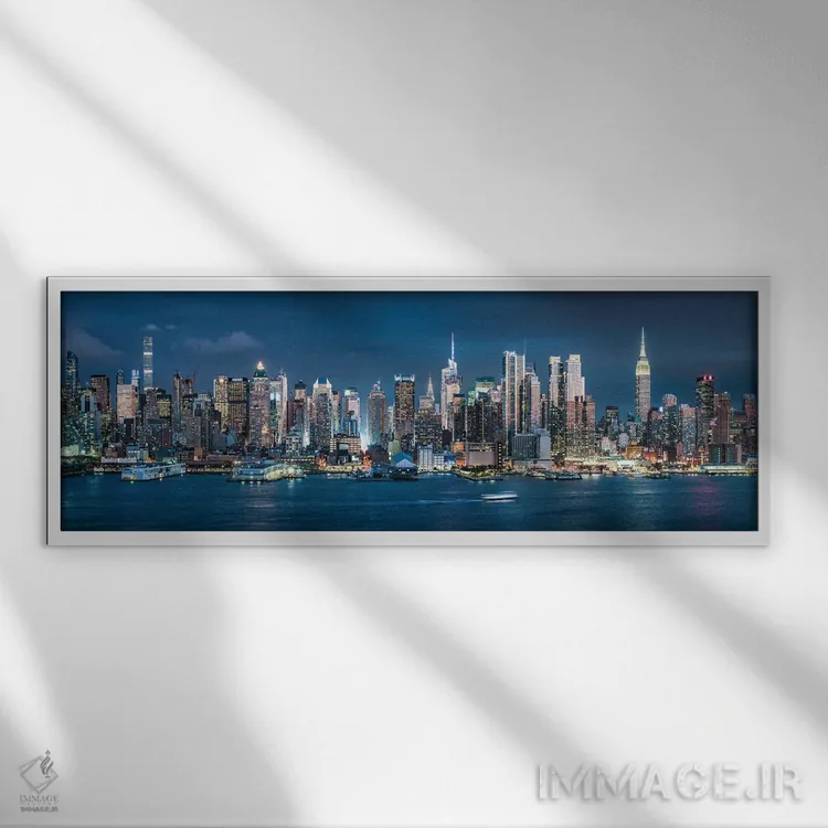 تابلو پانورامای افق منهتن در شب اثر یان بکه - نمای قاب‌دار سفید