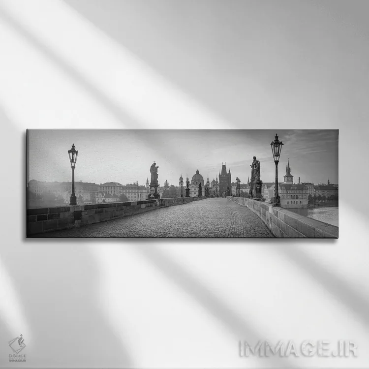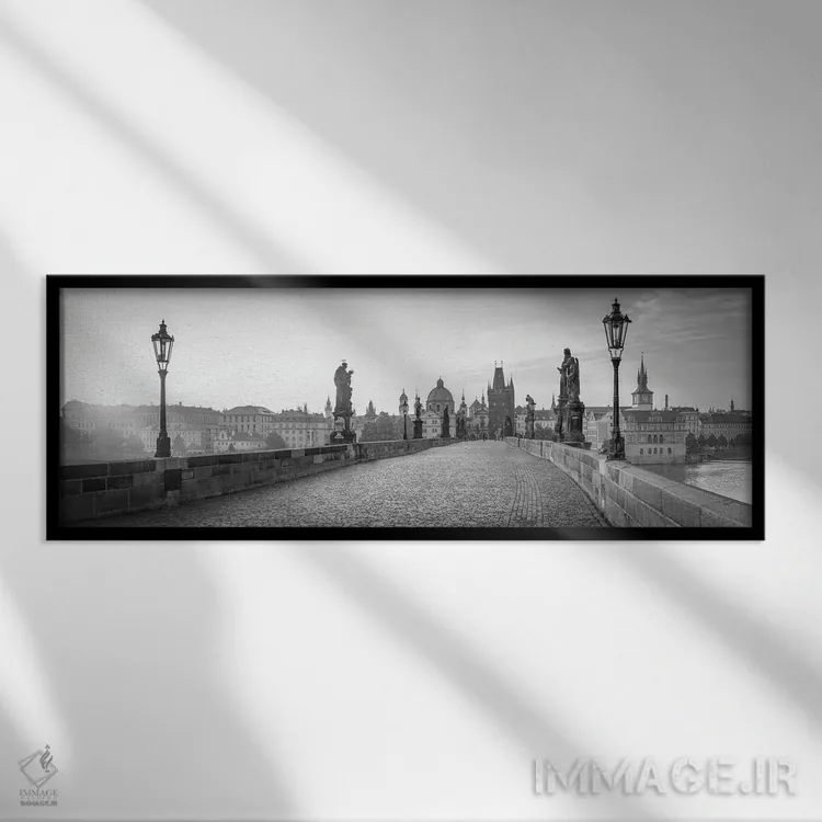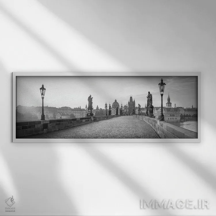 «Prague، Czech Republic، پانورامای پل چارلز به صورت سیاه و سفید، پراگ، جمهوری چک» اثرِ «یان بکه» در فضای عکاسی سیاهوسفید، روی نور و کنتراست تکیه میکند؛ موضوعِ این اثر برای دکورهای مینیمال عالی است.
