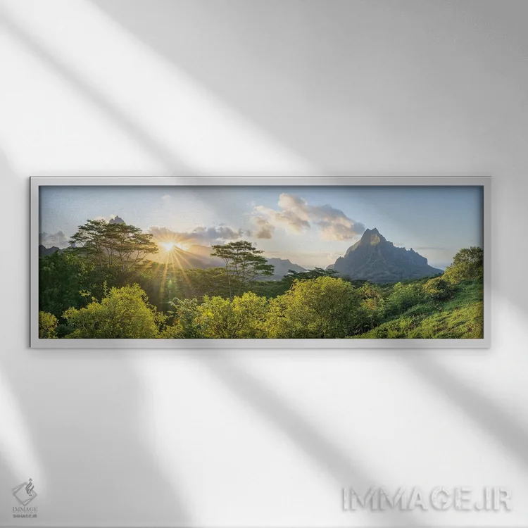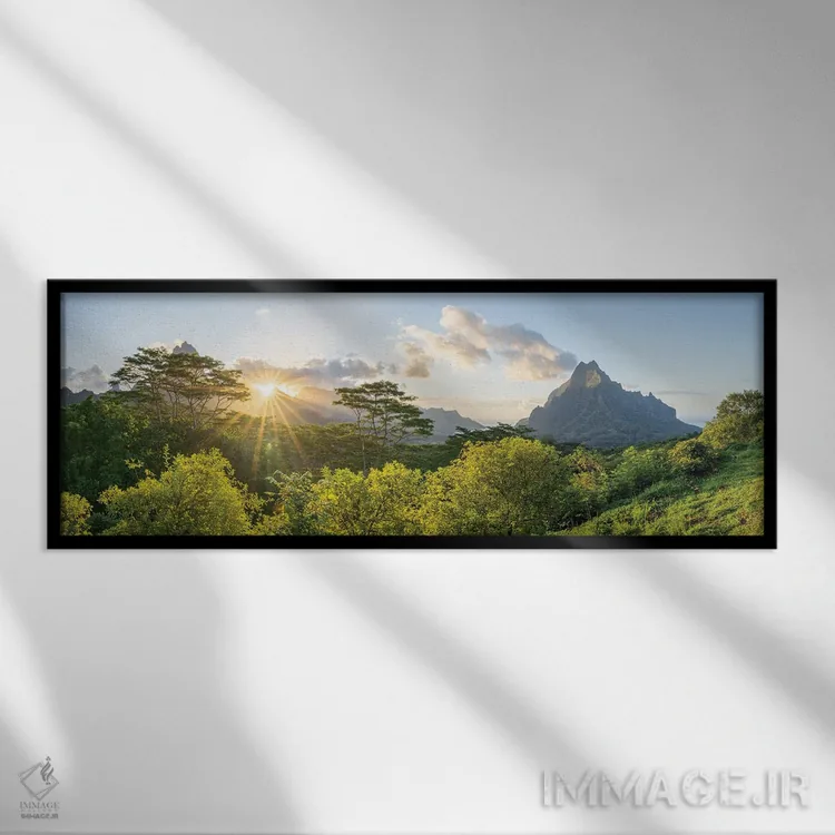 تابلو Moorea Island, French Polynesia,منظره غروب کوه روتویی از نقطه دید بلودر، مورئا، پلی‌نزی فرانسه اثر یان بکه - نمای قاب‌دار سفید