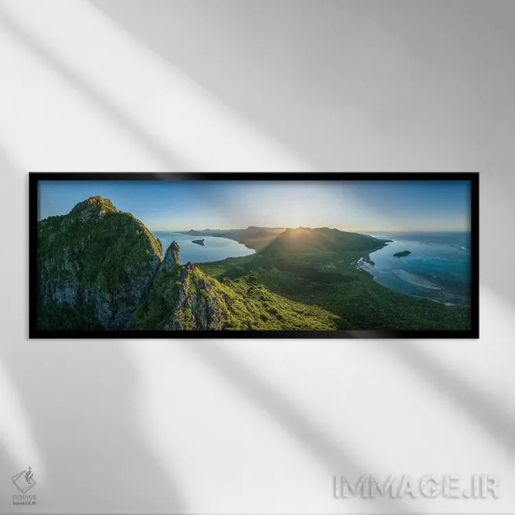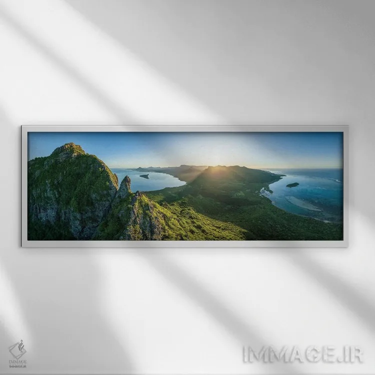 تابلو طلوع خورشید از بالای کوه لمورن برابانت در جزیره موریس اثر یان بکه - نمای قاب‌دار سفید