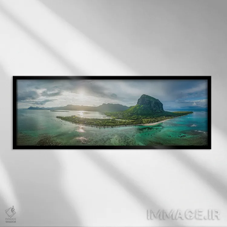 تابلو پانورامای هوایی از جزیره موریس در هنگام طلوع خورشید اثر یان بکه - نمای قاب‌دار مشکی