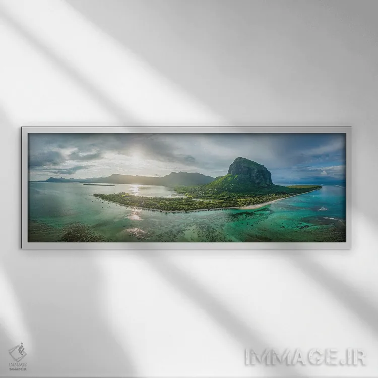 تابلو پانورامای هوایی از جزیره موریس در هنگام طلوع خورشید اثر یان بکه - نمای قاب‌دار سفید