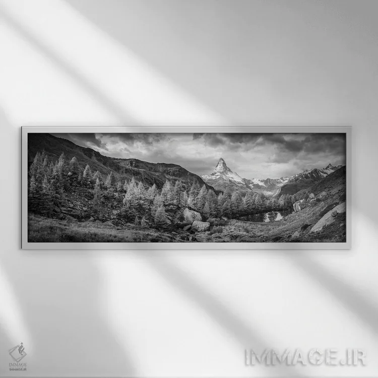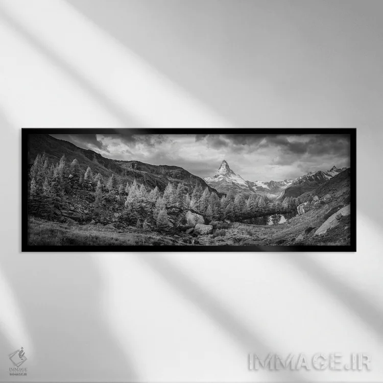 «Zermatt، Swiss Alps، Switzerland، پانوراما از کوه ماترهورن سیاه و سفید، زرمات، آلپ سوئیس، سوئیس» اثرِ «یان بکه» در فضای عکاسی سیاهوسفید، روی نور و کنتراست تکیه میکند؛ موضوعِ این اثر برای دکورهای مینیمال عالی است.