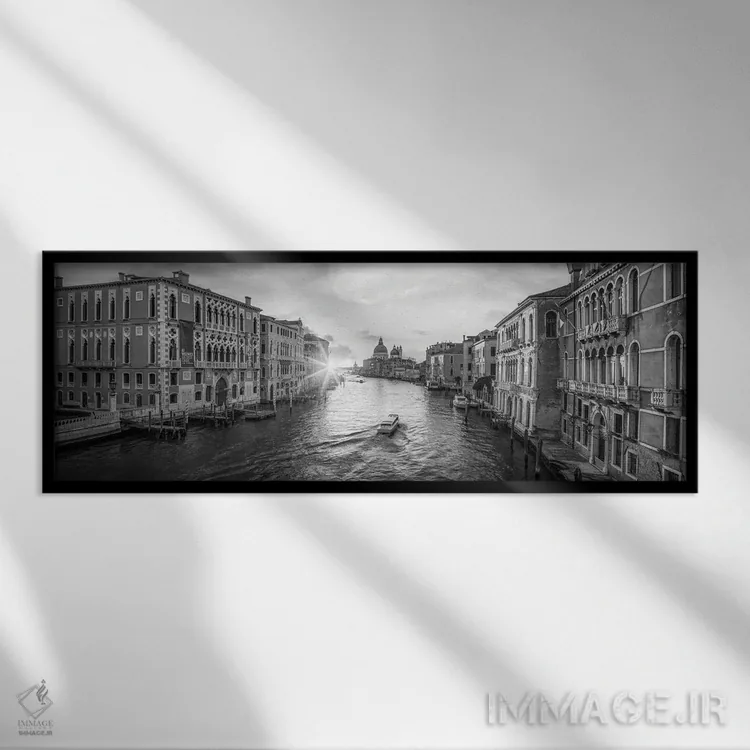 در «Venice، Italy، نمای پانورامی کانال بزرگ ونیز در طلوع آفتاب، ایتالیا»، اثرِ «یان بکه» این اثر را با زبان سیاهوسفید ارائه میکند؛ برای دکورهای کلاسیک—مدرن یک انتخاب مطمئن و هماهنگپذیر است.