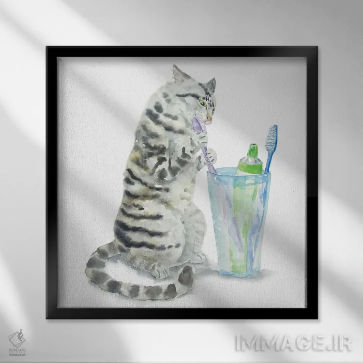 تابلو دکوراتیو گربه تیبی خاکستری و مسواک ها اثر آلکسی دیمیتریویچ شمیروف