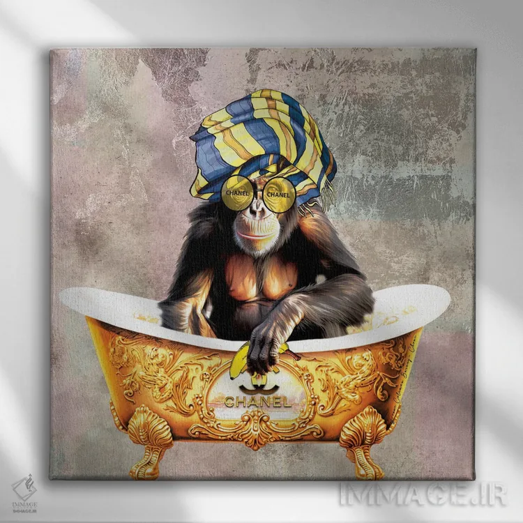 تابلو میمون شنل در وان (برند مد) اثر هنرِ چونی - نمای روبه‌رو روی دیوار