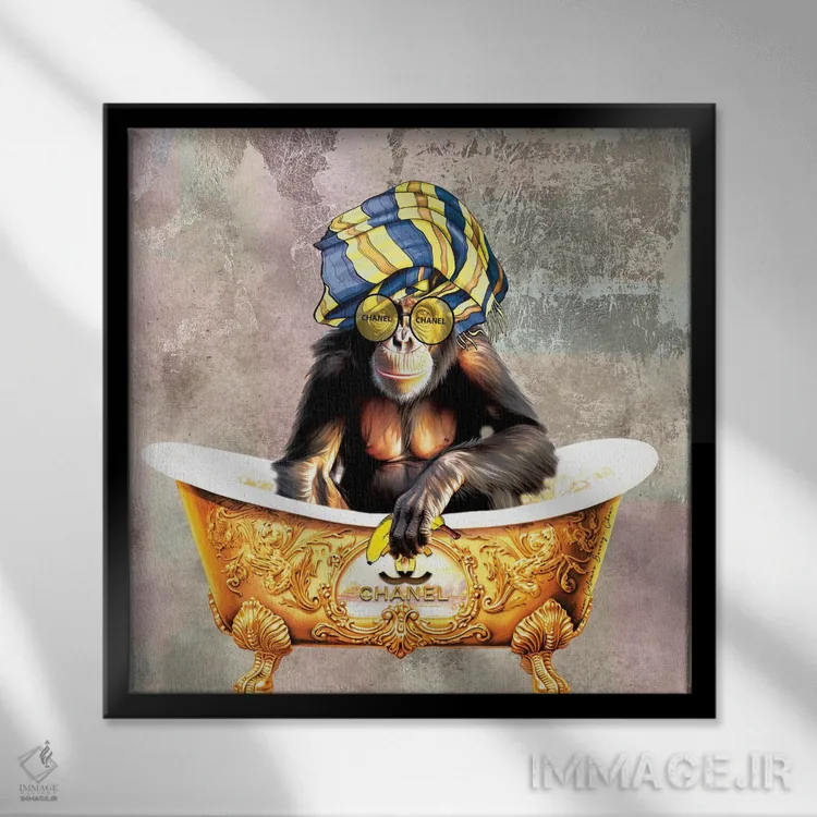 تابلو میمون شنل در وان (برند مد) اثر هنرِ چونی - نمای قاب‌دار مشکی