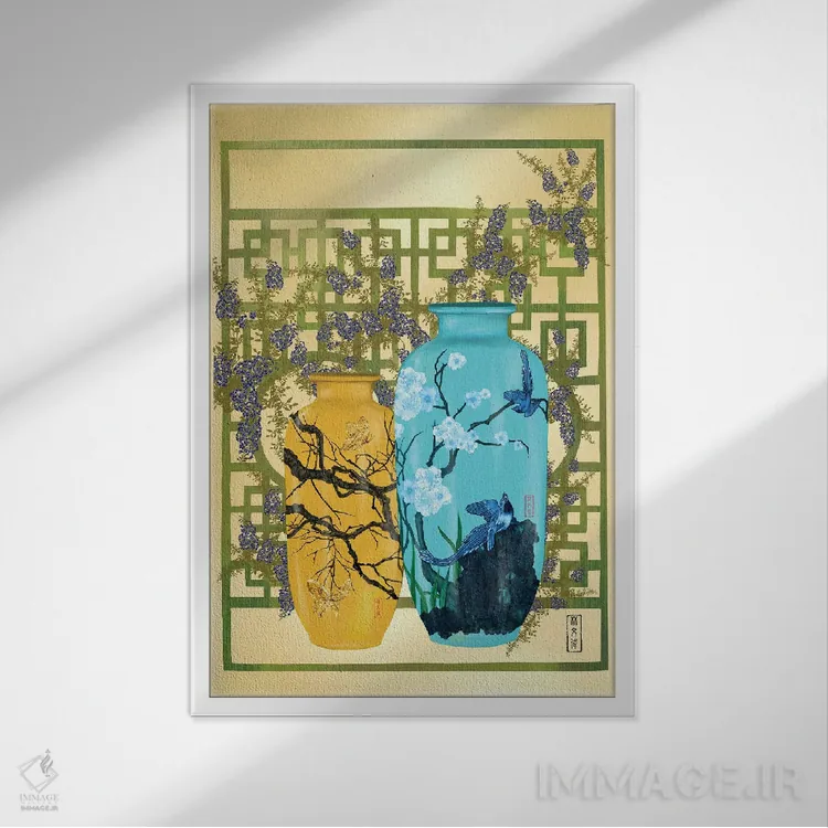 براساس پالت ترکیبی اثر، قاب بلوط روشن (چوبی) پیشنهاد اول است و استخوانی ملایم مکمل. برای سفارشهای پروژهای با ابعاد و قابهای اختصاصی با ایماژ در تماس باشید.
