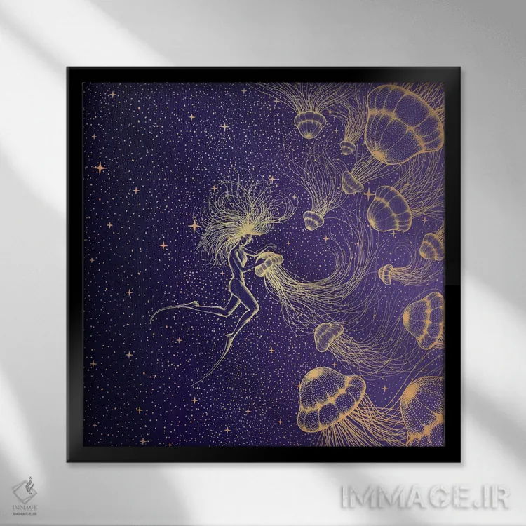 برای دیوارهای ساده، «غواص و عروس دریایی» اثرِ «علیرضا چاکر» به دیوار، انرژیِ نرم و زنده میدهد؛ برای دیوار کنار میز کار انتخابی خوشسلیقه است. هم فضا را گرم میکند، هم شلوغش نمیکند.