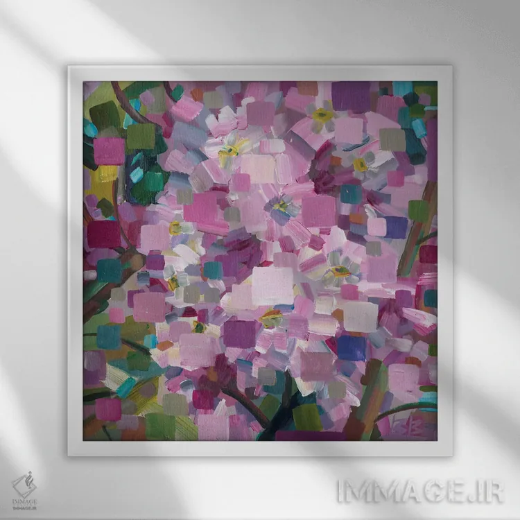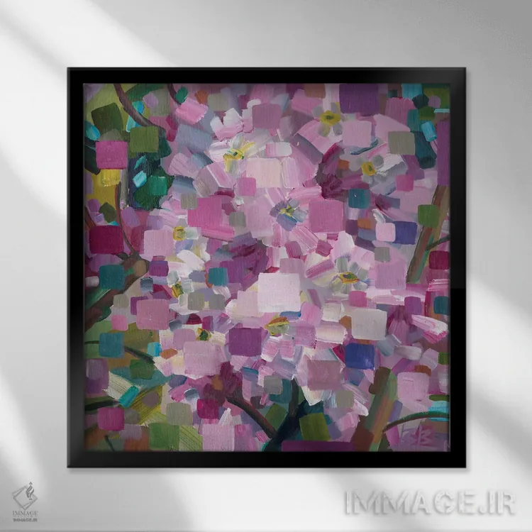براساس پالت ترکیبی اثر، قاب تیک گرم (چوبی) پیشنهاد اول است و مشکی مات (فریم متوسط) مکمل. برای سفارشهای پروژهای با ابعاد و قابهای اختصاصی با ایماژ در تماس باشید.