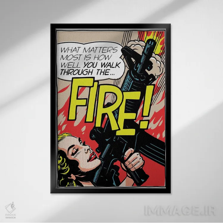 در «عبور از میان آتش» اثرِ «بوچر بیلی (هنرمند برزیلی پوپآرت)»، توجه به جزئیاتِ گرافیکی و تعادل رنگی دیده میشود؛ مناسب برای دیوار شاخص.