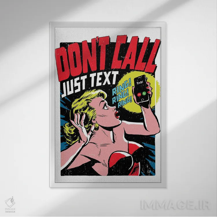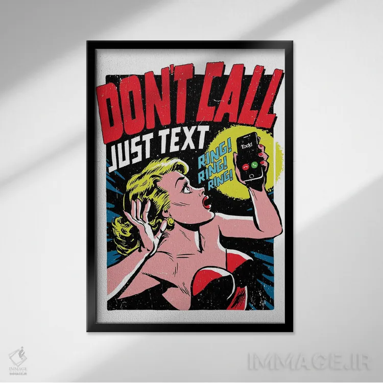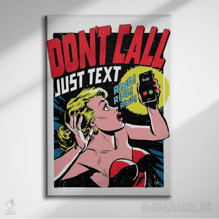 تابلو دکوراتیوِ «زنگ نزن فقط پیام بده» با موضوعِ این اثر؛ مناسب برای نشیمن، اتاق خواب یا دیوار کنار میز ناهارخوری اثرِ «بوچر بیلی (هنرمند برزیلی پوپآرت)».