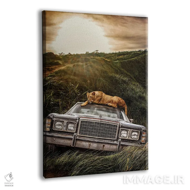 تابلو شیر ماده و خودروی قدیمی در جنگل اثر آدریان ویریو