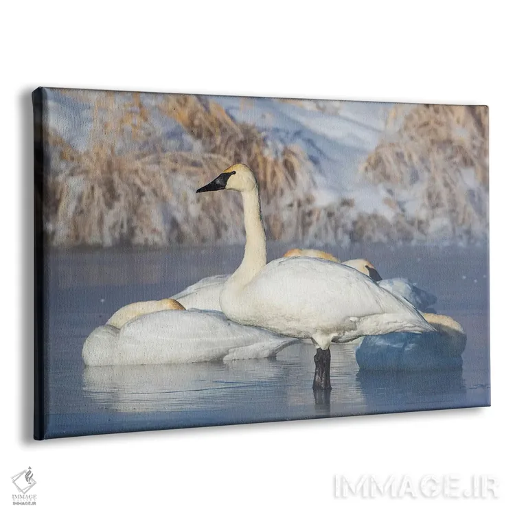 تابلو آمریکا، شهرستان سابلت، وایومینگ، گروهی قو ترومپت‌زن در حال استراحت روی برکهٔ یخ‌زده اثر الیزابت بوم - نمای پرسپکتیو محصول