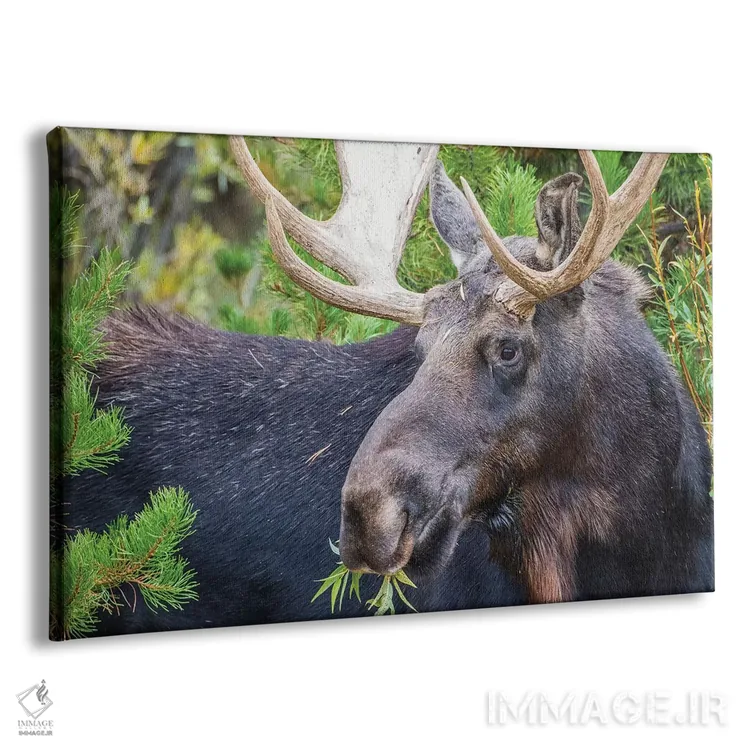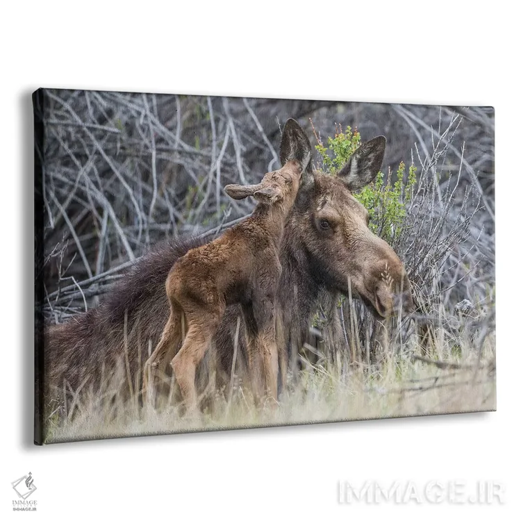 تابلو آمریکا، وایومینگ، گوساله تازه متولد شده گوزن موس کنار مادرش در میان بوته‌های بید نوازش می‌کند اثر الیزابت بوم - نمای پرسپکتیو محصول
