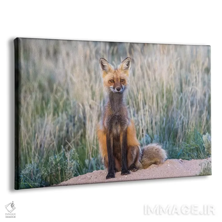 تابلو آمریکا، وایومینگ، شهرستان سابلت، روباه قرمز ماده نشسته بر ورودی لانه‌اش اثر الیزابت بوم - نمای پرسپکتیو محصول