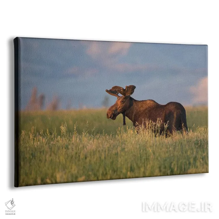 تابلو آمریکا، وایومینگ، شهرستان سابلت، گوزن نر آمریکایی ایستاده در میان علف‌های بلند در نور غروب اثر الیزابت بوم