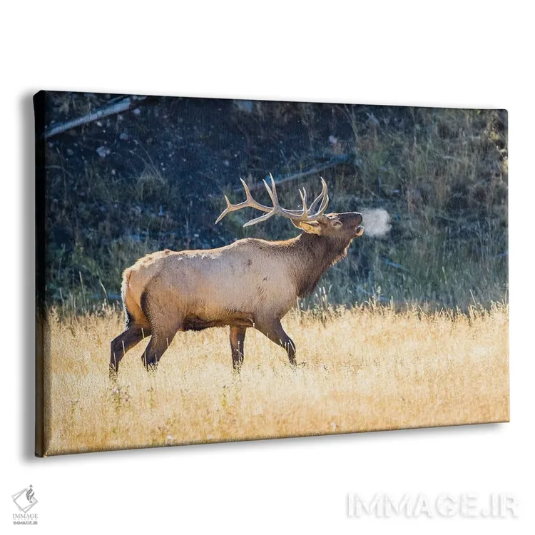 تابلو آمریکا، وایومینگ، پارک ملی یلواستون، گوزن نر آمریکایی در هوای پاییزی صدایش را بلند می‌کند اثر الیزابت بوم - نمای پرسپکتیو محصول