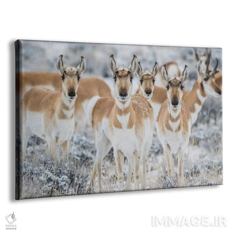 تابلو وایومینگ، شهرستان سابلت. گروهی کنجکاو از شاخ‌بری‌ها ایستاده در بوته‌های مریم‌گلی در زمستان اثر الیزابت بوم - نمای پرسپکتیو محصول
