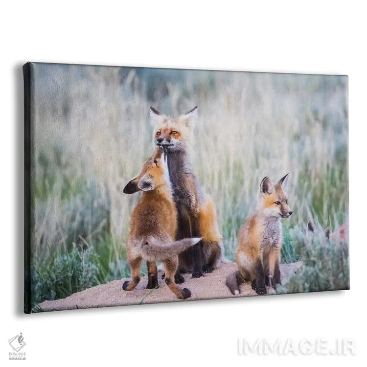 تابلو وایومینگ، شهرستان سابلت. توله روباه سرخ با بوسه‌ای از مادرش استقبال می‌کند هنگام بازگشت او به لانه اثر الیزابت بوم - نمای پرسپکتیو محصول