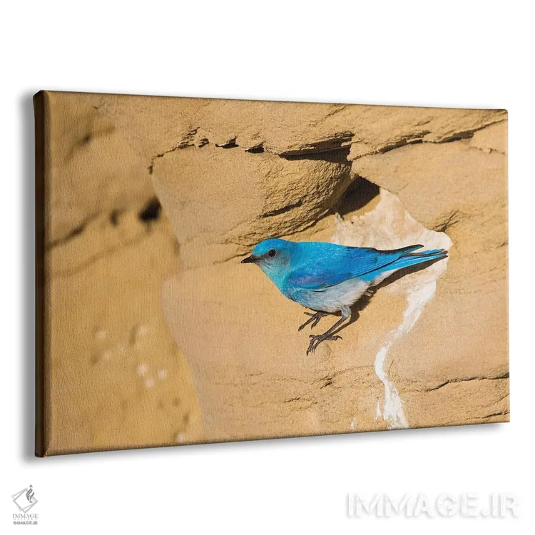 تابلو وایومینگ، شهرستان سابلت. پرندهٔ نر کوهستانی آبی از نمای لانه‌اش در صخرهٔ ماسه‌سنگی پرواز می‌کند اثر الیزابت بوم - نمای پرسپکتیو محصول