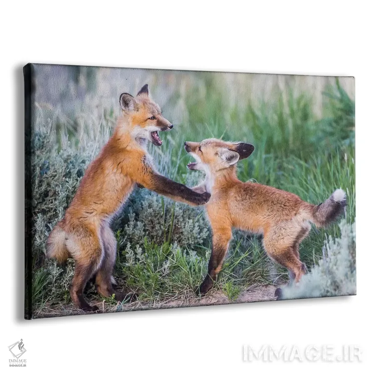 تابلو وایومینگ، شهرستان سابلت. دو توله روباه سرخ در بوته‌های مریم‌گلی نزدیک لانه‌شان بازی می‌کنند اثر الیزابت بوم - نمای پرسپکتیو محصول