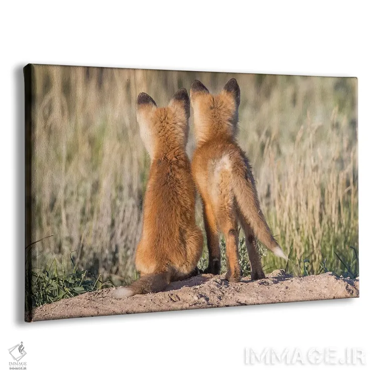 تابلو دو توله روباه جوان از لانه منتظر بازگشت پدر یا مادر خود با غذا هستند، آمریکا، وایومینگ، شهرستان سابلت اثر الیزابت بوم - نمای پرسپکتیو محصول