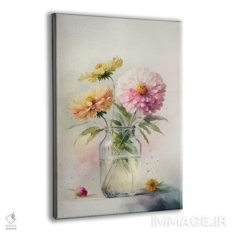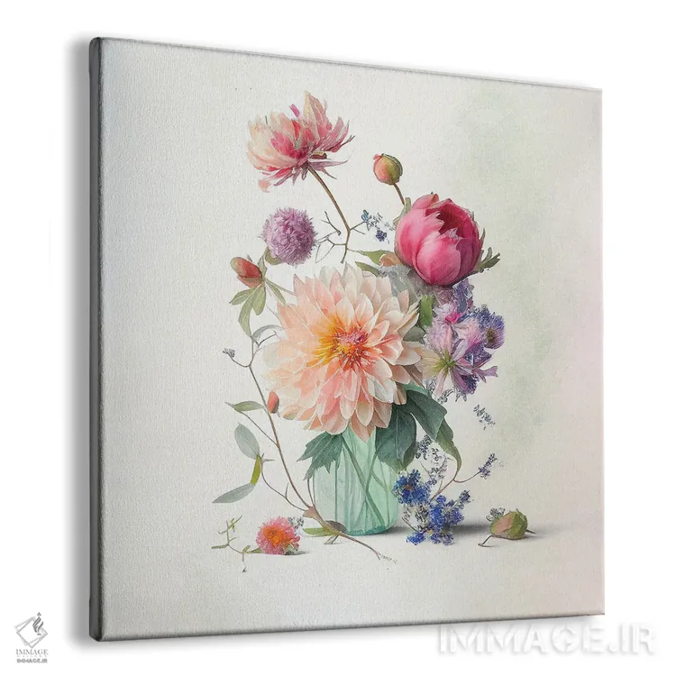 تابلو دکوراتیو دسته گل داهلیا در شیشه آبی اثر لیا مک لین