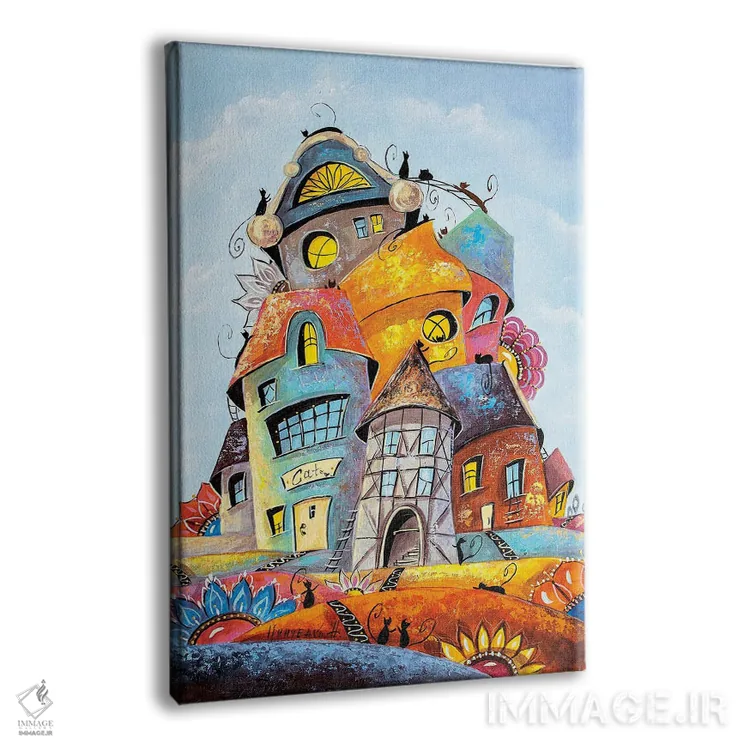 تابلو دکوراتیو خانه های رنگارنگ در شهر گربه ها اثر ناتالیا گرینچنکو - نمای پرسپکتیو محصول