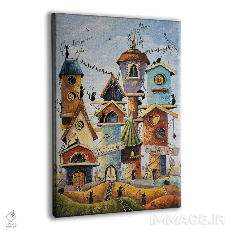 تابلو دکوراتیو خانه های رنگارنگ در شهر گربه ها اثر ناتالیا گرینچنکو