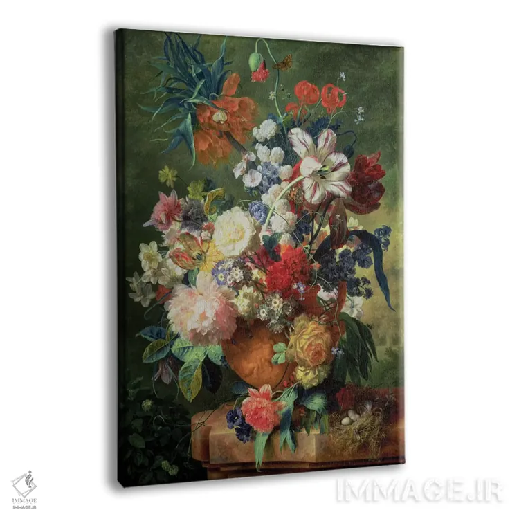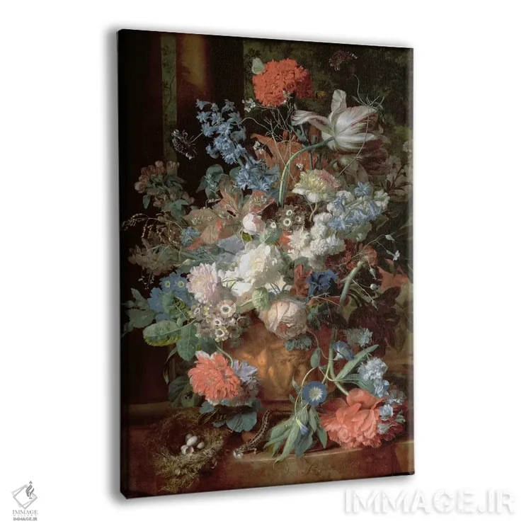 تابلو کلاسیک طبیعت بی جان از گل ها و لانه پرنده روی پایه اثر یان فان هویسوم