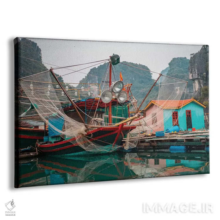 تابلو آسیا، ویتنام، کوانگ نین، خلیج ها لونگ. قایق ماهیگیری رنگارنگی که در اسکلهاش منعکس در آبهای آرام خلیج شده است. اثر برایس مریل