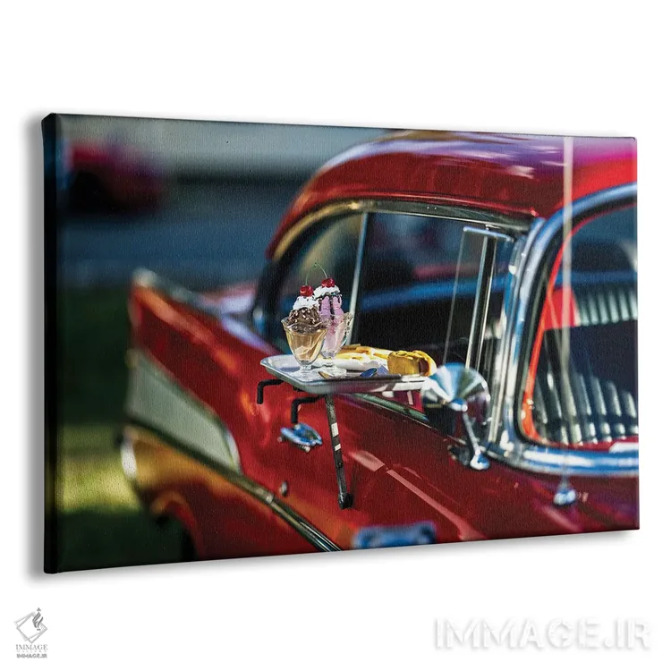 تابلو دکوراتیو دسر بستنی و هات داگ به همراه سیب زمینی در پنجره ماشین کلاسیک… اثر جورج اوزه