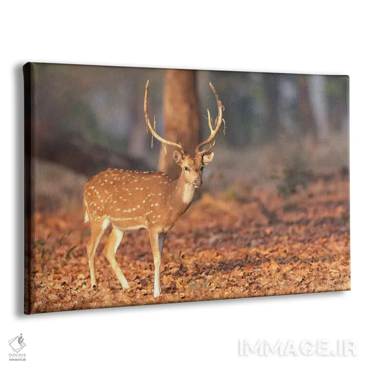 تابلو هند، ایالت مادیا پرادش، پارک ملی کانها. پرتره‌ای از یک گوزن خال‌دار با مخمل کهنه‌ای که از شاخ‌هایش آویزان است اثر الن گاف - نمای پرسپکتیو محصول