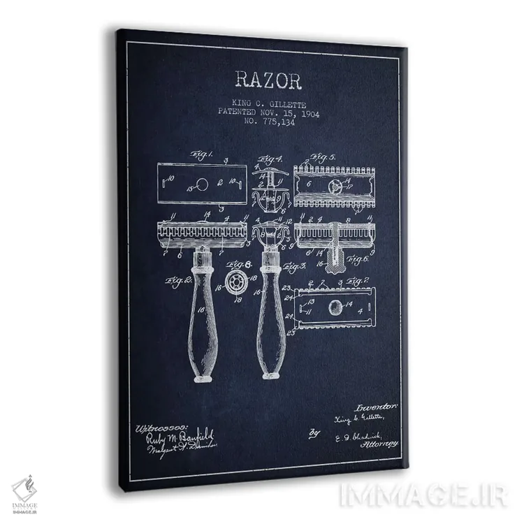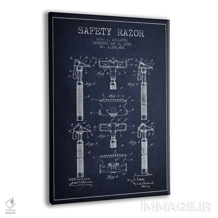 تابلو نقشهٔ ثبت اختراع تیغ اصلاح (آبی نفتی) اثر پیکسل کهنه (استودیو/نام هنری)