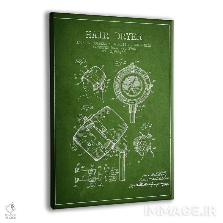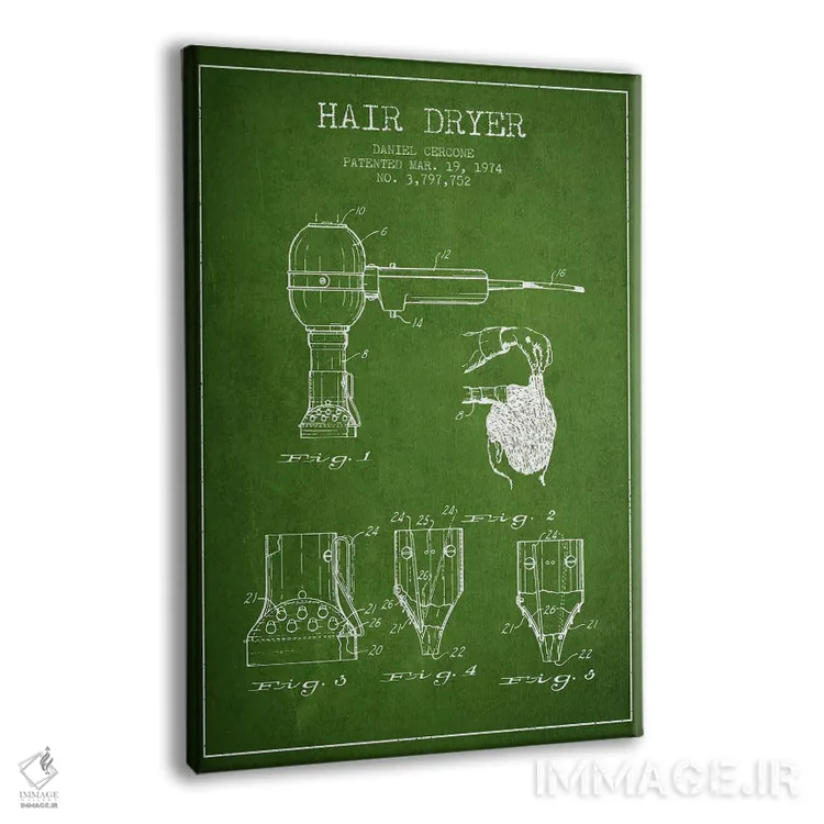 تابلو نقشهٔ ثبت اختراع سشوار صدادار (سبز) اثر پیکسل کهنه (استودیو/نام هنری) - نمای پرسپکتیو محصول