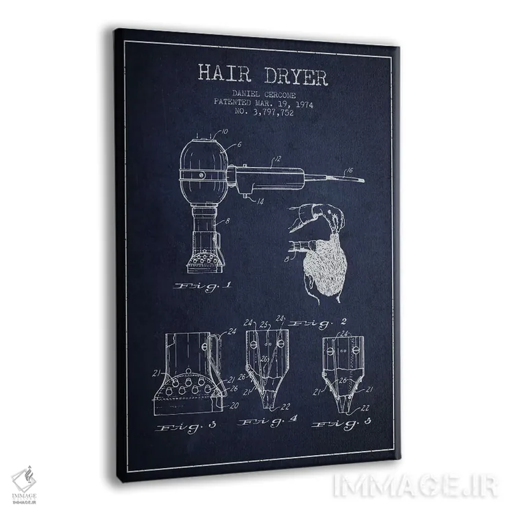 تابلو نقشهٔ ثبت اختراع سشوار (آبی نفتی) اثر پیکسل کهنه (استودیو/نام هنری) - نمای پرسپکتیو محصول