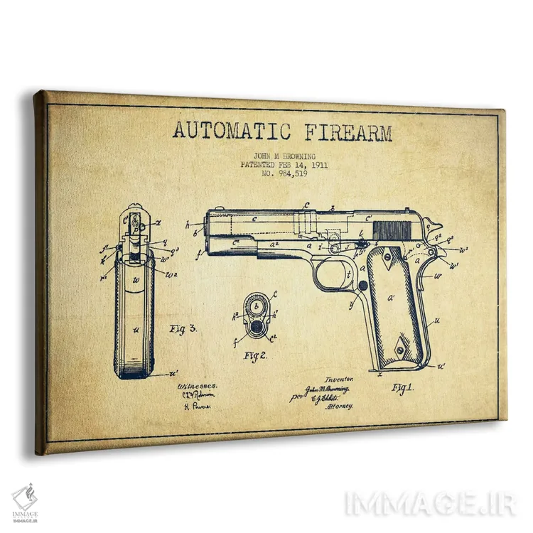 تابلو نقشهٔ ثبت اختراع تفنگ برونینگ قدیمی اثر پیکسل کهنه (استودیو/نام هنری)
