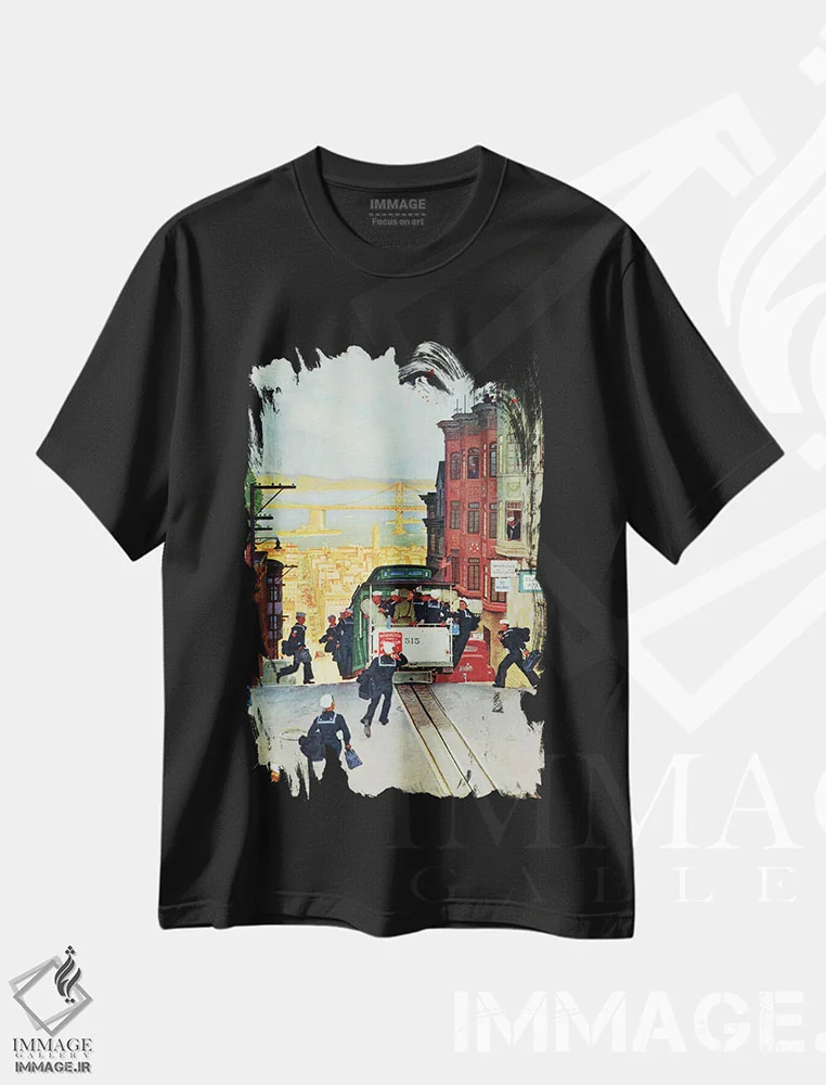 تیشرت مشکی طرح دار تراموای سانفرانسیسکو، دکور آمریکایی اثر مید شفر | فروشگاه ایماژ تیشرت طرح دار تراموای سانفرانسیسکو اثر مید شفر