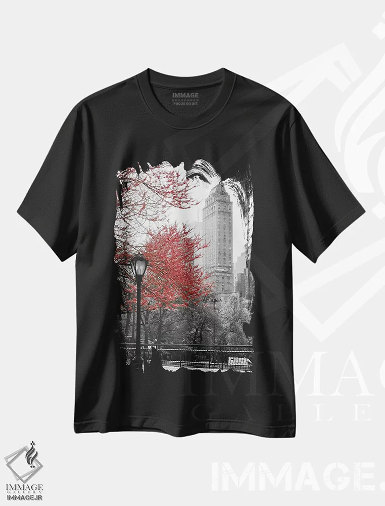 تیشرت مشکی طرح دار سنترال پارک با درخت قرمز، تزئینی اثر امیلی ناواس | فروشگاه ایماژ تیشرت طرح دار سنترال پارک با درخت قرمز اثر امیلی ناواس