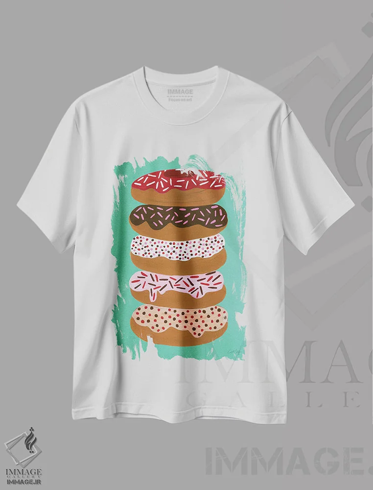 تیشرت سفید طرح دار دونات های لایه ای نعنا، دکور معاصر اثر کت کوکیلت | فروشگاه ایماژ تیشرت طرح دار دونات های لایه ای نعنا اثر کت کوکیلت