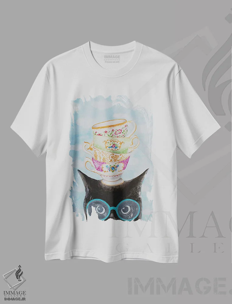 تیشرت سفید طرح دار گربه با فنجان های روی هم، تزئینی اثر کوکو د پاریس | فروشگاه ایماژ تیشرت طرح دار گربه با فنجان های روی هم اثر کوکو د پاریس