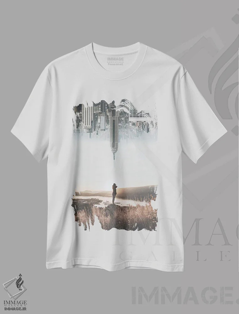 تیشرت سفید طرح دار مابین زمین و آسمان، عکاسی دو نوردهی اثر لوک آنتونی گرم | فروشگاه ایماژ تیشرت طرح دار مابین زمین و آسمان اثر لوک آنتونی گرم