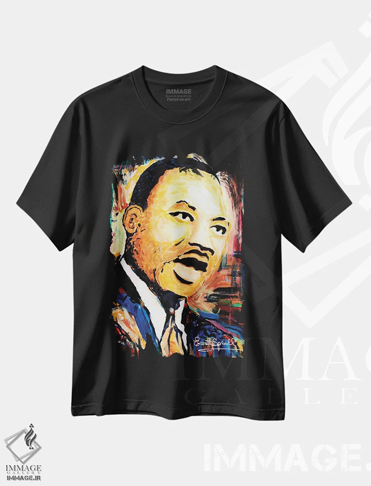 تیشرت مشکی طرح دار آثار اورِت اسپرویل - immage.ir تیشرت طرح دار پرترهٔ مارتین لوتر کینگ با تمبرهای پستی آمریکا اثر اورِت اسپرویل