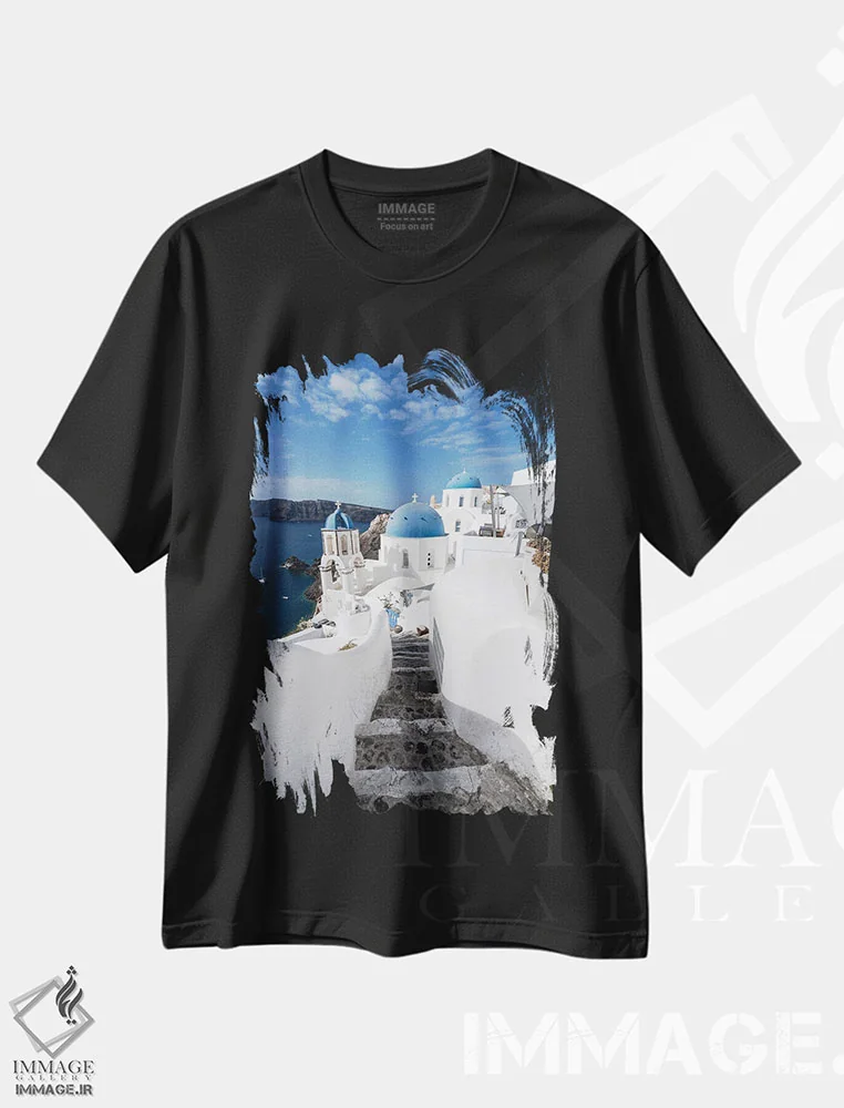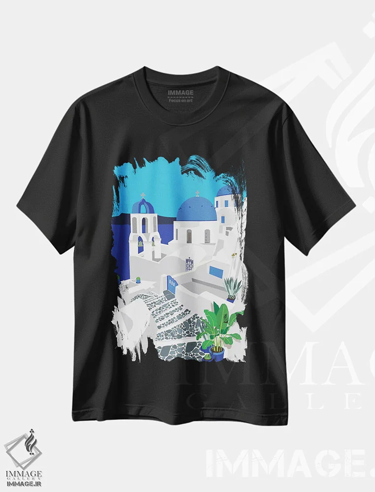 تیشرت مشکی طرح دار تعطیلات تابستانی سانتورینی، تزئینی اثر جیدا الاسار | فروشگاه ایماژ تیشرت طرح دار تعطیلات تابستانی سانتورینی اثر جیدا الاسار
