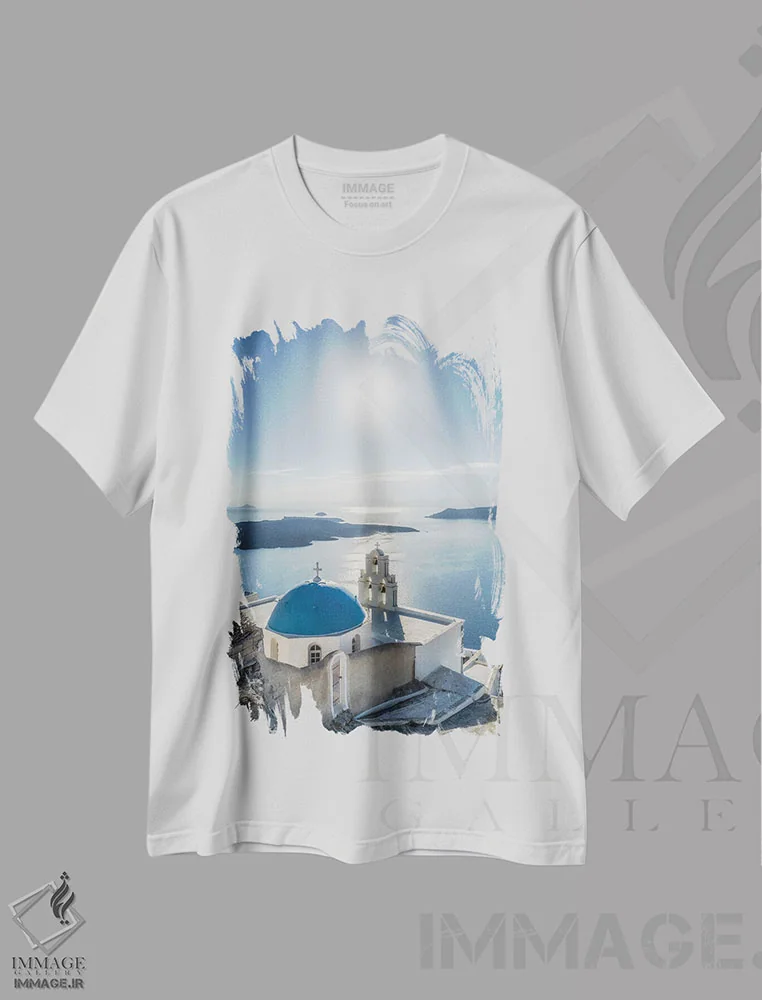 تیشرت سفید طرح دار – تیشرت هنری ,گنبد کلیسای سانتورینی اثر مونا ادولسکو فروشگاه ایماژ تیشرت طرح هنری ,گنبد کلیسای سانتورینی اثر مونا ادولسکو