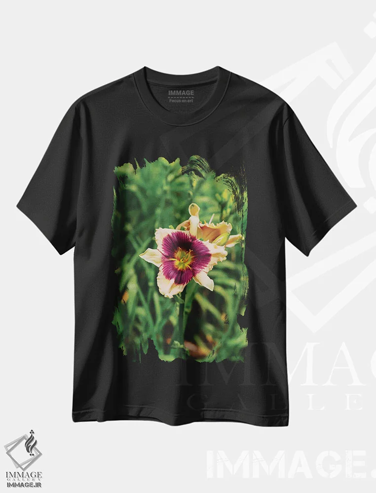 تیشرت مشکی طرح دار باغ سوسن روز ۵، مدیوم اثر بثانی یانگ | فروشگاه ایماژ
