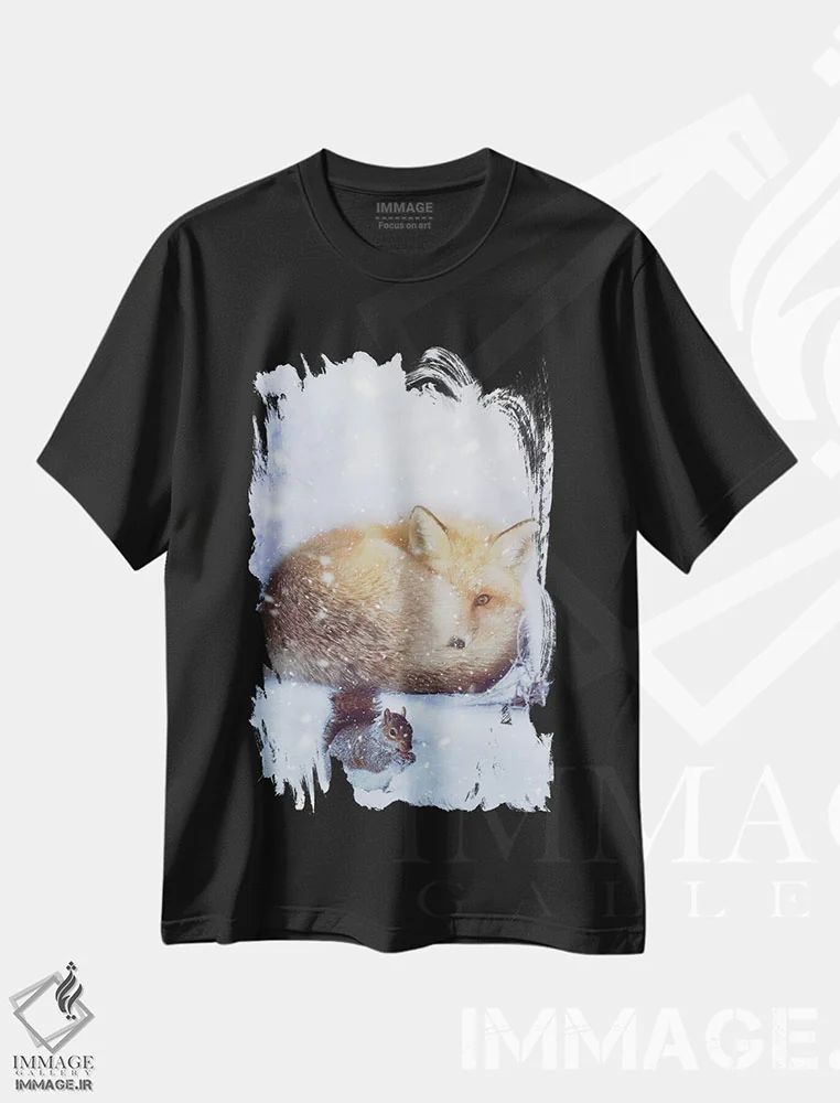 تیشرت مشکی طرح دار روباه قرمز و سنجاب در زمستان، هنر دیجیتال اثر جن زد | فروشگاه ایماژ